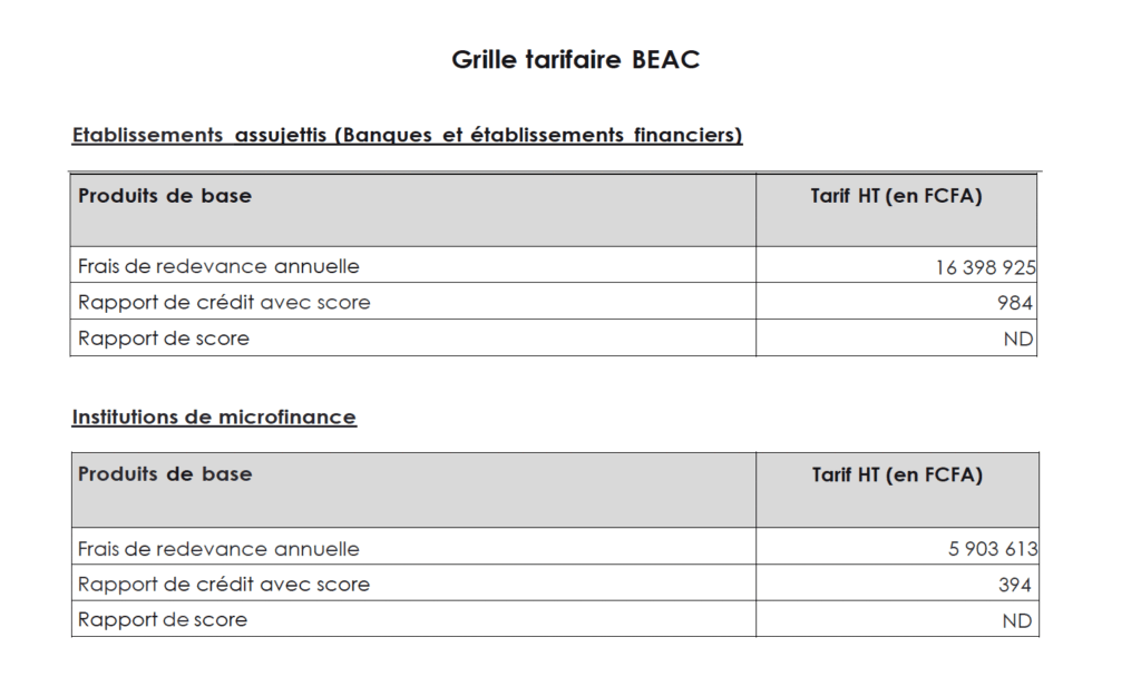 La tarification appliquée par le Bureau d’Information sur le Crédit (BIC CEMAC) est une